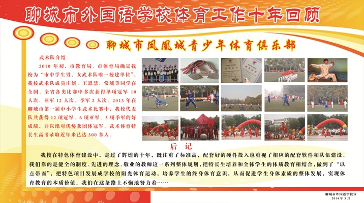2016年聊城市外国语学校 招收高中男子篮球男女武术特长生的通知 聊城市外国语学校是聊城一中创办的全市特色名校,现有小学部、初中部、高中部三部分组成。学校办学特色鲜明,管理科学,教学严谨,尤其是体育特长生的培养居于全市前列,赢得了社会和广大学生家长的高度认可和一致好评,成为广大学生求学的首选。2015年起,学校决定在新高一实施小班化教学,开启我市高中小班化教学的先河。 小班化教学利于实施真正意义上的因材施教,给我校体育生的培养创设了更为优越的条件。十年来,我校体育组围绕“抓特长,求特色”这一发展规划,经过不懈努力,形成了一支德才兼备、团结奋进、敢于挑战、勇于创新的教师队伍,各项体育教学和群众体育活动也得以有条不紊地开展,体育特长生的高考录取人数逐年递增:04年录取16人,05年录取34人,06年录取45人,07年录取56人,08年录取78人,09年录取101人, 10年录取110人,11年录取117人,12年录取120人,13年、14年、15年在我校特长生数量大幅减少的情况下,专业过关率依然达到100%,向国家和高等院校输送了大批人才。 2009年,我校创建了“聊城市凤凰城青少年体育俱乐部”,成为国家体育总局批准的首批国家级青少年体育俱乐部。2010年初,市教育局、市体育局确定我校为中学生男子篮球队和男女武术队的唯一市队校建单位。2011年7月,省体育局、省教育厅批准我校为山东省体育“篮球传统项目”学校。我校篮球队曾多次参加山东省运动会、省篮球锦标赛、省篮球传统项目比赛,并取得优异成绩:2010年至今连续四年五次荣获聊城市中学生篮球赛冠军,2009、2011年分别获聊城市市直机关成人篮球赛季军和亚军,2013年获聊城市第二届运动会篮球赛亚军。近年来,已有近100多名同学通过篮球考试升入各名牌高等院校。2010年武术队成立以来,我校武术队队员庄妍、王恩慧、桑慧欣、李伟、常城等同学在全国、省、市各类比赛中共获国家级冠军 5人次、省级冠军 12人次、市级冠军30人次。特别在第一届聊城市中小学生武术比赛中,我校代表队共获得12项冠军、6项亚军、3项季军的好成绩,并以绝对优势获团体冠军。武术体育特长生高考录取已达300多人,充分体现了我校创建篮球、武术特色,倡导篮球、武术精神,弘扬篮球、武术文化,实现了“健体,启智”的目标。今年我校继续面向全市初中学校招收男子篮球、男女武术特长生。具体报名考试安排如下: 报名时间:2016年4月5日——4月30日 报名地点:学校政教处 报名办法:两张一寸免冠照片,报名费60元 报名电话:0635— 5108816 5108859 咨询电话:李老师13061517676 贾老师13406828321闫老师8108656(武) 考试科目: 篮球: 1.助跑摸高 2.全场8字运球上篮 3.五对五全场比赛 武术: 1.竖叉,立定跳远 2.考生可在拳术(长拳、南拳、太极拳)或自选器械中任选一项进行测试 考试时间、地点:5月初在学校篮球场考试。 录取办法:专业成绩合格者,根据成绩等次按市教育局文件规定分别加分。中考成绩与专业加分之和达我校录取分校线者,方能被我校录取。 篮球考试内容、办法与标准: 1.助跑摸高 助跑单脚(或双脚)起跳摸高,以摸高的最高高度计分,每人做两次,取最佳成绩。 2.全场8字运球上篮 考生从篮球场一端线持球出发,开始计时,全场8字运球绕障碍物到另一端篮下运球上篮后,再8字运球返回起点篮下上篮,当球落至球篮水平线以下时停表,运球投篮时,球不中不需补篮,一次不中在原成绩上加两秒。每人两次机会,取最佳成绩。 根据以上两项成绩综合排名,择优进行下一项五对五全场比赛,确定最终加分名单。 3.五对五全场比赛。 测试办法 根据考生人数进行全场的编队比赛,采用全场人盯人防守的办法来测试技术和战术的运用能力。每场比赛时间要以能够全面观察,了解每个考生的情况而定。 评定标准 1.个人攻击能力:主要观察技术运用合理性和熟练程度,重点看投篮动作和时机把握、突破动作的技巧和传接球的时机。(20分) 2.防守能力:主要观察个人的防守能力和与同伴协同防守的能力。具体看个人的防守动作的连贯性和身体的协调性以及步伐的快速移动。(20分) 3.战术意识:主要观察个人在全场比赛中攻守转换意识和个人技术在比赛中运用的合理性,重点看个人进攻能力以及与队友的配合意识。(20分) 4.发展潜力:主要观察个人的综合素质;身高、速度、弹跳等个人内在能力的发展潜力。(40分) 武术考试内容、办法与标准: 一.专项技术 1.测试方法: (1)考生可在拳术(长拳、南拳、太极拳)和自选器械中任选一项进行测试。 (2)采用整套演练的方法进行测试。完成套路的时间规定: ①自选类套路、南拳套路完成套路的时间不少于1分钟。 ②太极类套路:完成套路的时间5-6分钟。 2.专项技术评分标准 专项套路技术的最高得分为80分。评分标准如下: (1)动作质量(分值为30分) ①凡动作姿势规范、方法运用合理、技术熟练,整套动作完成质量好者,给予25--30分。 ②凡动作姿势较规范、方法运作较合理、技术较熟练、整套完成质量较好,给予15--25分。 ③凡动作规格一般、方法运用不清晰、技术熟练程度一般,整套完成有明显的失误者,给予5--15分。 (2)演练水平(分值为30分) ①凡完成套路节奏分明、协调流畅、编排合理、风格突出、劲力充实、精神饱满者,给予25--30分。 ②凡完成套路节奏较分明,动作较流畅、套路编排较合理、