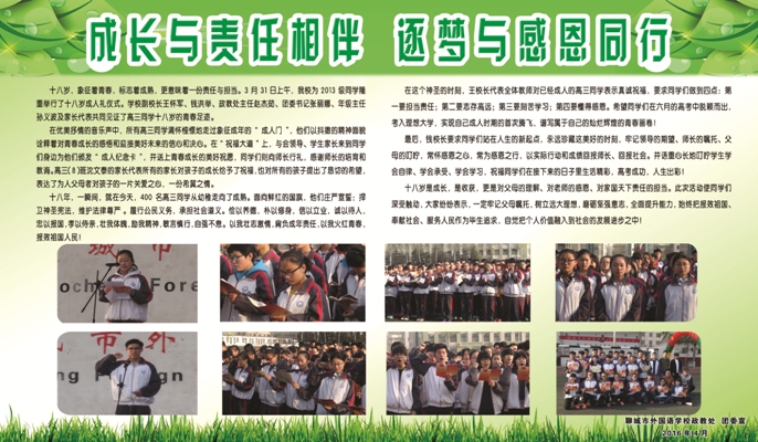 锐意进取 展翅腾飞 聊城市外国语学校(高中部) 一、锐意进取,特色办学,聊城市唯一实行小班化教学的高中。 纵观中外卓有成就的人,他们一生的成功往往不是赢在起点,而是赢在了转折点! 十五六岁的孩子,他们就正好处于初中升高中的转折点上,因此,如何根据自身特点选择适合自己的高中就成为每个初三毕业生必须慎重考虑的人生大事,也成为家长们帮助孩子进行抉择的家庭难题。 聊城市外国语学校适应社会发展的需求,为了给广大初三毕业生提供更加理想的学习生活环境,倾心打造精细化精英教育,学校自2015级起,高中部开始了小班化教学新模式,开启了我市高中小班化教学的先河。 我校高中部小班化教学新模式在借鉴小学部、初中部小班化教学成功经验的基础上,经过高中2015级全体师生一年来小班化教学的实践,让我们坚信这一教学模式为适应小班化教学的学生搭建了一座实现梦想的最好的舞台,为“有梦想 做主人”的学生提供了一个绝佳的学习生活环境。 小班化教学的主要优势及具体做法: 1、班额小,便于因材施教、高效管理。三十八人的小班额,教师能轻松关注到每一位学生,无论教学、管理,还是发展特长、享受教育资源,都给孩子们提供了无尽的可能。超前的理念,铸造完美班级,成就未来英才。 2、导师制,让每位学生得到老师的充分关注。为从根本上保障“不让一个学生掉队”,学校实施“导师制”。每位导师定向负责4-6名学生,为每位学生量身定做培养计划,对其进行学习辅导、生活指导、思想疏导,力求使学生好学乐学、积极阳光、理想远大。 3、合作学习让学生参与课堂交流、心灵沟通的的机会更多。随着课堂教学改革的深入开展,合作学习进入小班制效果更佳。班级内每4-5人排成一个学习小组,通过自学、讨论、答疑、展示、归纳总结等五个环节让学生主动学习,使优秀生充分展示自己的才华,学困生得到及时帮助。课堂上,教师不再是“讲师”,主要工作是为学生创设情境,引导学生自主学习,让学生在讨论中反思、拓展,巩固所学知识。合作学习让学生成为课堂的主人,学习的主人,极大地调动了学生学习的积极性。 4、小班化教学有利于及时、针对性地解决学生学习中遇到的问题。实践证明,小班化教学有利于让每位学生有疑必答、有惑必解、有求必应,第一时间解决问题,不留夹生饭,不积累过夜题,真正实现堂堂清、日日清,通过周小节和每周错题再现的方式实现周周清,避免了大班额教学中一个老师在45分钟时间内辅导60多名学生的尴尬与被动。 5、小班化教学有利于学生的作业得到老师的精批细改和面批面改。避免了因作业批改任务重而出现的阅而不改、改而不批、批而不精的粗糙做法,让每个学生的每次作业都成为一次知识的补救,方法的指引,精神的鼓舞。刚刚结束的全市高一期末统考,各名次段人数与中考相比都有了大幅度地提升。 6、小班化教学更能满足学生在新高考制度下走班选课学习模式的需求。 二、 展翅腾飞,捷报频传,连年高考不断实现新突破。 1、展翅腾飞。2014年我校高考取得优异成绩,高考上线人数、上线率较上年度有了大幅度的提升,特别是全市当年仅有5名飞行员被大学录取的情况下,我校学生宋豪,以高考553分的成绩被中国人民解放军空军航空大学录取. 2、捷报频传,历史突破。2015年高考我校取得历史性辉煌战绩。高三毕业生396人,本科上线325人,本科上线率82.1%;一本上线率增长52.4%;理科最高分667分,全省理科排名2073名,位列整个聊城市前80名。 我校2015届毕业生,在2012年中考时,大都是当年聊城一中第二志愿到外国语就读的学生,在我校科学创新办学理念的指导下,凭借我校老师无私奉献的敬业精神、灵活多样的教学方法、扎实深厚的基本功底和卓越高超的教学水平,全体同学经过三年的努力学习,让原本对自己失去希望的学生有了自信,并点燃了心中拼搏自强的火焰, 实现了低起点、高落点的巨大突破。 以上成绩的取得并非偶然!根据2016年召开的全市高考总结会上公布的数据,从入口看出口,中考高考成绩比较重,我校是市区四所市直高中当中,唯一一所全市两重点考评名次段都进步的学校。 三、我们的优势。 1、学校有一支爱岗敬业、认真实干、甘于奉献、追求卓越的教师队伍。外国语学校任教的老师教育教学经验丰富、善于钻研、肯实干,讲奉献,他们针对自己的生源状况,在“不让一个学生掉队”的这一理念的指导下,钻研《课标》,精心编制符合本校学情的教学案,用心上好每节课,精细化批改作业,注重对学生成人成才的引领,正在用自己的心血和汗水书写外国语的辉煌,向社会递交一份满意的答卷。 2、学校在教学上以落实“三讲”、“三不讲”为中心,致力于“高效课堂”的打造。 “三讲”:讲重点,讲难点,讲易错易混知识点。“三不讲”:不讲学生已经会的,不讲学生通过自学也能会的,不讲老师讲了学生也不会的。 学校还特别从教学的基本环节入手,细化备课、听课、上课、辅导、考试、作业批改等环节的工作要求,尤其是加大了对教学案的编写质量与批改的督促检查力度,确保每套题和每个教学案都是高质量且对学生分层次区别要求、难以分层,适合学情。 为激发学生的兴趣,提高学生的自信心,学校通过“降低命题的难度”、“教什么考什么”、“向落实和效率要质量”等措施,落