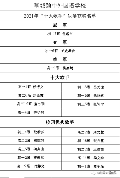 经过现场激烈角逐,初二7班徐嘉言获得冠军、初一6班王威墨含获得亚军、高一1班吴嘉琦获得季军。高一1班侯博文等7名同学荣获2021年“校园十大歌手”称号,初二4班耿毅多等10名同学荣获“校园优秀歌手”称号。