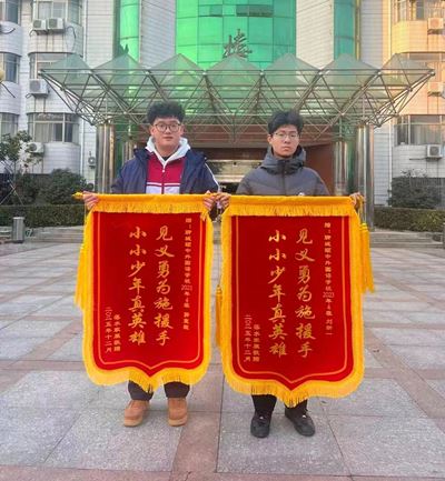 落水者被救上岸后,家属十分感激。同时,落水者家属也深知,若不是两位同学和热心市民的及时出手相助,后果将不堪设想。为了表达心中的感激之情,落水者家属特地来到我校,送来了“见义勇为施援手,小小少年真英雄”以及“教育有方育栋梁,见义勇为显担当”的两面锦旗。锦旗上的字字字句句,都饱含着家属对郭宣毅和刘新一同学的谢意,也承载着对我校育人成果的高度人认可。