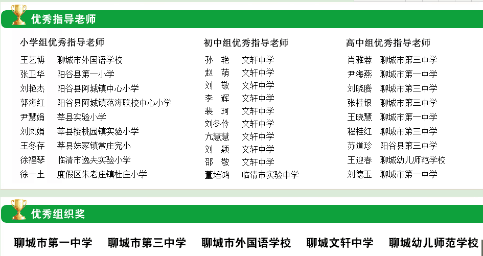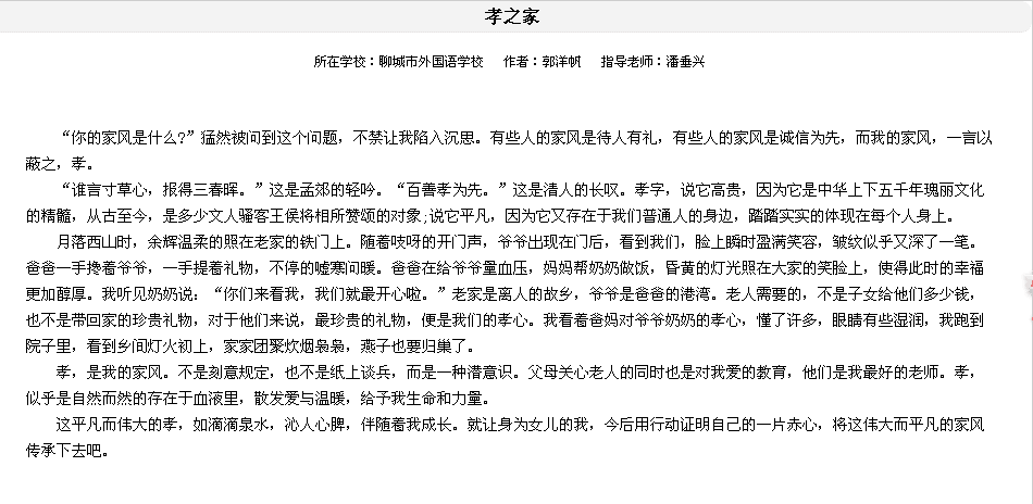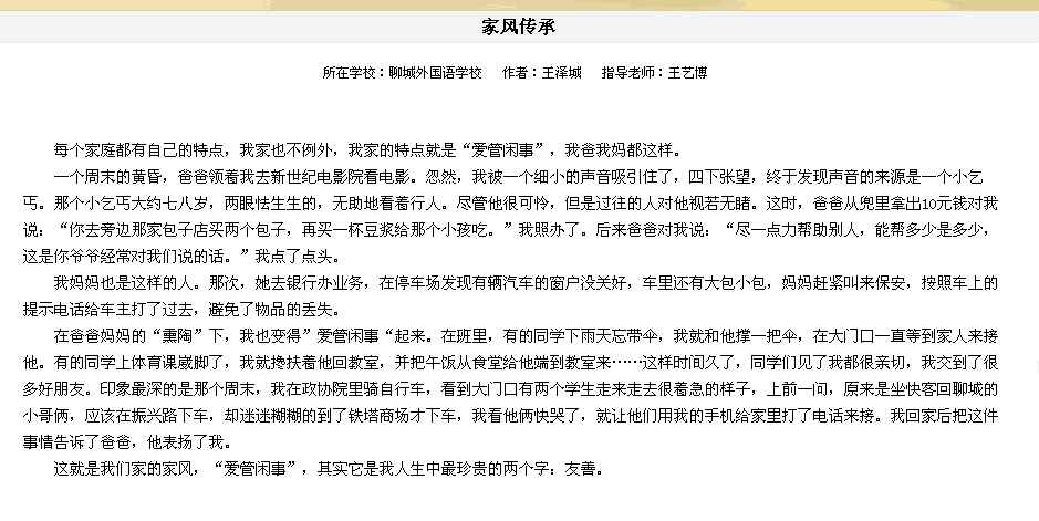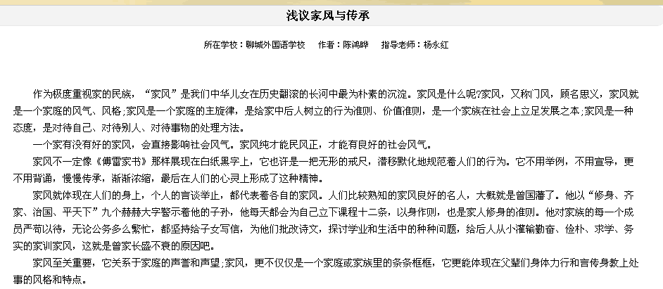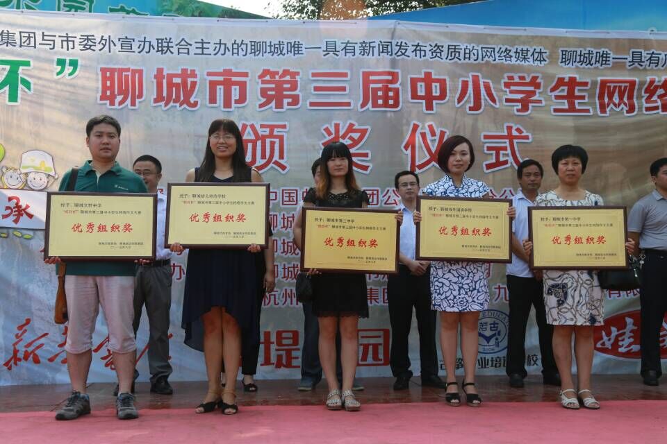 6月10日—7月31日聊城市新闻网主办了以“家风传承”为主题的第三届中小学生网络作文大赛,我校有6名学生获得奖项。其中小学部王泽城、初中部赵小龙、陈鸿晔获得三等奖;小学部苏荣鹏、袁承泽、郭洋帆获得优秀奖。王艺博、刘德玉老师获得优秀指导奖。我校获得优秀组织奖。