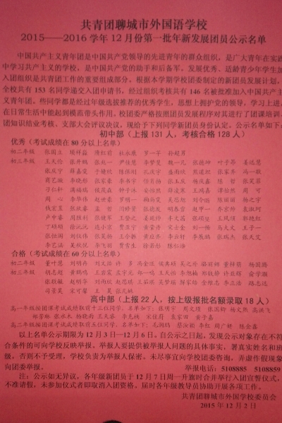 经年级推荐、组织考察考核、团课培训、团知识结业测试、支部大会评议决议、公示无异议等几个环节,本次我校共有146名同学被批准加入中国共青团,光荣地成为一名新团员。至此2015——2016学年12月份第一批新团员发展工作结束。下附图片及社团新闻稿。