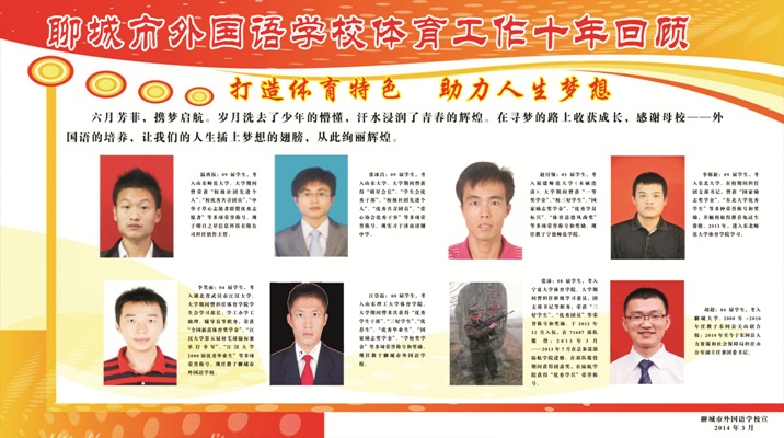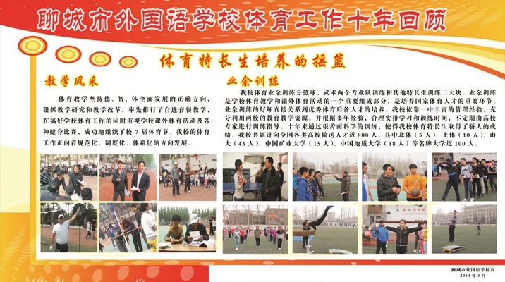 2016年聊城市外国语学校 招收高中男子篮球男女武术特长生的通知 聊城市外国语学校是聊城一中创办的全市特色名校,现有小学部、初中部、高中部三部分组成。学校办学特色鲜明,管理科学,教学严谨,尤其是体育特长生的培养居于全市前列,赢得了社会和广大学生家长的高度认可和一致好评,成为广大学生求学的首选。2015年起,学校决定在新高一实施小班化教学,开启我市高中小班化教学的先河。 小班化教学利于实施真正意义上的因材施教,给我校体育生的培养创设了更为优越的条件。十年来,我校体育组围绕“抓特长,求特色”这一发展规划,经过不懈努力,形成了一支德才兼备、团结奋进、敢于挑战、勇于创新的教师队伍,各项体育教学和群众体育活动也得以有条不紊地开展,体育特长生的高考录取人数逐年递增:04年录取16人,05年录取34人,06年录取45人,07年录取56人,08年录取78人,09年录取101人, 10年录取110人,11年录取117人,12年录取120人,13年、14年、15年在我校特长生数量大幅减少的情况下,专业过关率依然达到100%,向国家和高等院校输送了大批人才。 2009年,我校创建了“聊城市凤凰城青少年体育俱乐部”,成为国家体育总局批准的首批国家级青少年体育俱乐部。2010年初,市教育局、市体育局确定我校为中学生男子篮球队和男女武术队的唯一市队校建单位。2011年7月,省体育局、省教育厅批准我校为山东省体育“篮球传统项目”学校。我校篮球队曾多次参加山东省运动会、省篮球锦标赛、省篮球传统项目比赛,并取得优异成绩:2010年至今连续四年五次荣获聊城市中学生篮球赛冠军,2009、2011年分别获聊城市市直机关成人篮球赛季军和亚军,2013年获聊城市第二届运动会篮球赛亚军。近年来,已有近100多名同学通过篮球考试升入各名牌高等院校。2010年武术队成立以来,我校武术队队员庄妍、王恩慧、桑慧欣、李伟、常城等同学在全国、省、市各类比赛中共获国家级冠军 5人次、省级冠军 12人次、市级冠军30人次。特别在第一届聊城市中小学生武术比赛中,我校代表队共获得12项冠军、6项亚军、3项季军的好成绩,并以绝对优势获团体冠军。武术体育特长生高考录取已达300多人,充分体现了我校创建篮球、武术特色,倡导篮球、武术精神,弘扬篮球、武术文化,实现了“健体,启智”的目标。今年我校继续面向全市初中学校招收男子篮球、男女武术特长生。具体报名考试安排如下: 报名时间:2016年4月5日——4月30日 报名地点:学校政教处 报名办法:两张一寸免冠照片,报名费60元 报名电话:0635— 5108816 5108859 咨询电话:李老师13061517676 贾老师13406828321闫老师8108656(武) 考试科目: 篮球: 1.助跑摸高 2.全场8字运球上篮 3.五对五全场比赛 武术: 1.竖叉,立定跳远 2.考生可在拳术(长拳、南拳、太极拳)或自选器械中任选一项进行测试 考试时间、地点:5月初在学校篮球场考试。 录取办法:专业成绩合格者,根据成绩等次按市教育局文件规定分别加分。中考成绩与专业加分之和达我校录取分校线者,方能被我校录取。 篮球考试内容、办法与标准: 1.助跑摸高 助跑单脚(或双脚)起跳摸高,以摸高的最高高度计分,每人做两次,取最佳成绩。 2.全场8字运球上篮 考生从篮球场一端线持球出发,开始计时,全场8字运球绕障碍物到另一端篮下运球上篮后,再8字运球返回起点篮下上篮,当球落至球篮水平线以下时停表,运球投篮时,球不中不需补篮,一次不中在原成绩上加两秒。每人两次机会,取最佳成绩。 根据以上两项成绩综合排名,择优进行下一项五对五全场比赛,确定最终加分名单。 3.五对五全场比赛。 测试办法 根据考生人数进行全场的编队比赛,采用全场人盯人防守的办法来测试技术和战术的运用能力。每场比赛时间要以能够全面观察,了解每个考生的情况而定。 评定标准 1.个人攻击能力:主要观察技术运用合理性和熟练程度,重点看投篮动作和时机把握、突破动作的技巧和传接球的时机。(20分) 2.防守能力:主要观察个人的防守能力和与同伴协同防守的能力。具体看个人的防守动作的连贯性和身体的协调性以及步伐的快速移动。(20分) 3.战术意识:主要观察个人在全场比赛中攻守转换意识和个人技术在比赛中运用的合理性,重点看个人进攻能力以及与队友的配合意识。(20分) 4.发展潜力:主要观察个人的综合素质;身高、速度、弹跳等个人内在能力的发展潜力。(40分) 武术考试内容、办法与标准: 一.专项技术 1.测试方法: (1)考生可在拳术(长拳、南拳、太极拳)和自选器械中任选一项进行测试。 (2)采用整套演练的方法进行测试。完成套路的时间规定: ①自选类套路、南拳套路完成套路的时间不少于1分钟。 ②太极类套路:完成套路的时间5-6分钟。 2.专项技术评分标准 专项套路技术的最高得分为80分。评分标准如下: (1)动作质量(分值为30分) ①凡动作姿势规范、方法运用合理、技术熟练,整套动作完成质量好者,给予25--30分。 ②凡动作姿势较规范、方法运作较合理、技术较熟练、整套完成质量较好,给予15--25分。 ③凡动作规格一般、方法运用不清晰、技术熟练程度一般,整套完成有明显的失误者,给予5--15分。 (2)演练水平(分值为30分) ①凡完成套路节奏分明、协调流畅、编排合理、风格突出、劲力充实、精神饱满者,给予25--30分。 ②凡完成套路节奏较分明,动作较流畅、套路编排较合理、