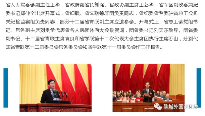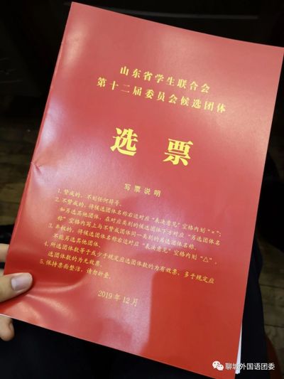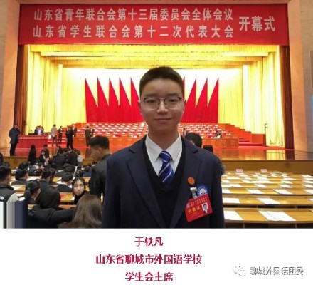 近日,我校高中学生会主席 于轶凡同学以正式代表的身份参加了山东省第十二次学联代表大会。参加本次大会的代表是经过了严格审核及遴选所产生的优秀学生代表。全省145所高校,210万在校生,正式代表产生比例为1‱;全省3500所普通中学,495万在校生;中等职业学校约400所,在校生约80万。正式代表产生比例为0.15‱。此次,我校学生能够参加这一盛事。不仅对于学生,对于学校也是很高的荣耀!近年,在共青团聊城市委、市直机关团工委、聊城一中党委以及外国语党总支的坚强领导和大力支持下,我校共青团连年获得各项高规格团内荣誉,可喜可贺!