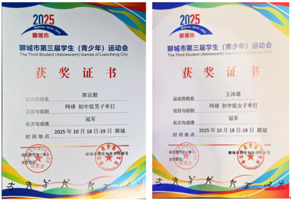 青春逢盛会,拼搏正当时。在刚刚落幕的聊城市第三届学生(青少年)运动会网球比赛中,我校初三4班郭宣毅同学和初二2班王沐瑶同学不仅以雷霆之势包揽男子单打、女子单打两项冠军,两位同学还凭借赛场上的文明风范与体育精神,都斩获了“体育道德风尚奖”,实现竞技成绩与精神文明的“双丰收”,在市级赛场上为聊城颐中外国语学校赢得了双重荣耀!